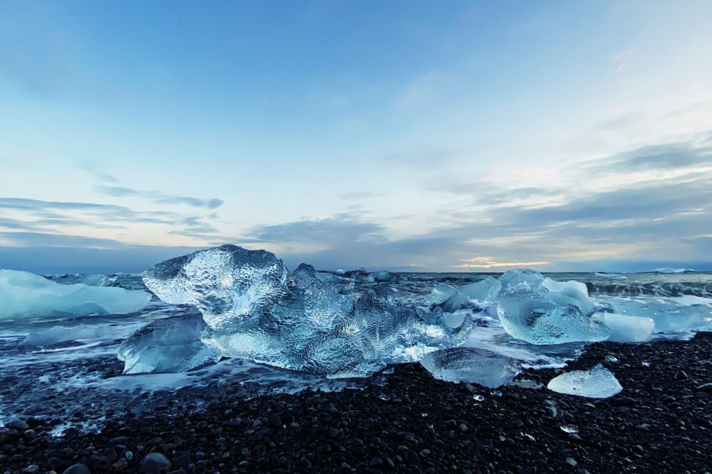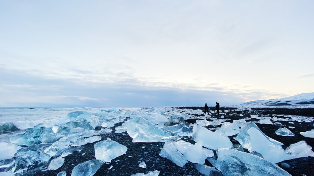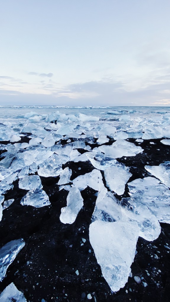 ถัดมาไม่ไกลกันตอนขากลับเราก็แวะที่ Diamond Beach อีกหนึ่งจุดไฮไลต์ของไอซ์แลนด์ ที่นี่คือหาดทรายสีดำที่เป็นชายฝั่งของเกาะไอซ์แลนด์ เมื่อก้อนน้ำแข็งไหลออกจากทะเลสาบโจกุลซาลอนสู่ทะเลแล้ว บางส่วนจะถูกคลื่นซัดพัดพากลับเข้ามาที่ฝั่งอีกครั้ง และมากองรวมกันที่ชายหาดแห่งนี้