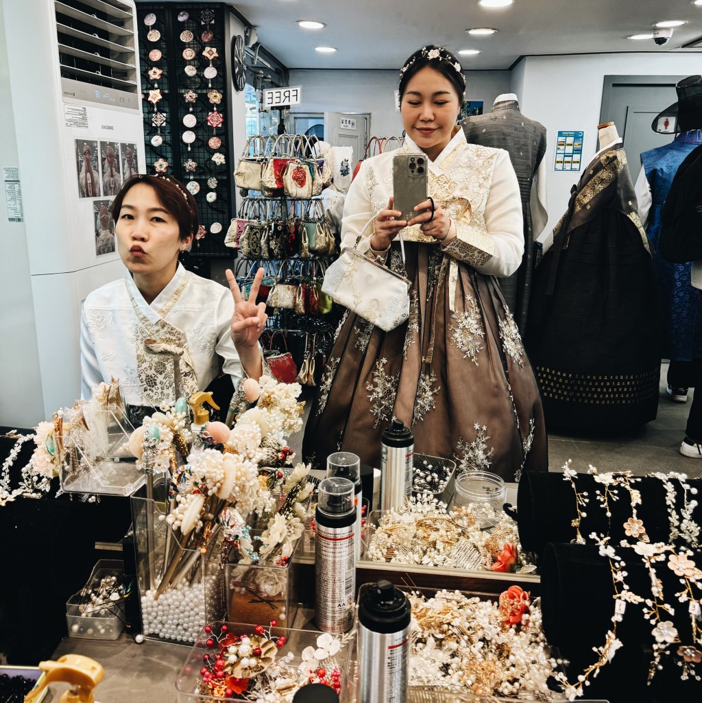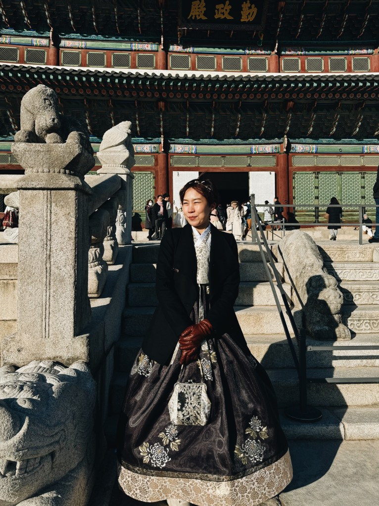 สิ่งที่พวกเราทำการบ้านมาเพียงอย่างเดียวคือจะเลือกใส่ชุดฮันบกสีอะไรดี ฮ่าๆ นอกนั้นคือไม่ได้หาข้อมูลอะไรมาเลย พวกเราเดินทางไปถึงลานด้านหน้าที่กว้างใหญ่มากกกก เห็นกลุ่มนักท่องเที่ยวในชุดฮันบกเดินไปมา เราก็เลยบอกว่าเดินตามนางไป เด๋วก็รู้ว่าร้านเช่าอยู่ไหนโดยไม่ต้องเสิชหา แล้วก็ใช่จริง ก็ไปเจอกลุ่มร้านเช่าชุดที่ก็อยู่อีกฟากถนนของวังนั่นแหละ เลือกได้ตามสไตล์ที่คุณชอบและจำนวนชั่วโมงที่ต้องการ เสร็จสรรพเราก็เดินถ่ายรูปฉ่ำตลอดทาง ประวัติศาสตร์อะไรใดๆ ไม่ได้อ่านเลย และน่าจะเดินไม่ครบด้วยเพราะมันกว้างและข้างในก็ซอยเป็น section ย่อยๆ เยอะจนงง พอครบชั่วโมงพวกเราก็เดินออกเอาชุดไปคืนและแปลงร่างกลับมาสู่ยุคปัจจุบันเหมือนเดิม