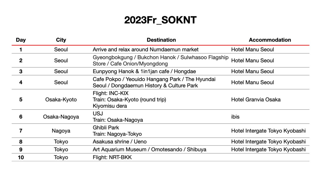 หลังจากล่อลวงเพื่อนมาได้แล้ว ก็เริ่มวางแพลนกัน ซึ่งแพลนที่ออกมานี่แน่นมากกกกก เพราะนี่คือเกาหลีครั้งแรกของพวกเรา ส่วนญี่ปุ่นก็คือเป็นโซนคันไซครั้งแรกของเพื่อนบวกกับความอยากไปเก็บโซน Super Nintendo กับ Ghibli Park ก็เลยกลายเป็นทริปสู้ชีวิตมากๆ ฮ่าๆ เอาล่ะ ไปดูกันว่าโซลครั้งแรกของพวกเราจะเป็นไง
