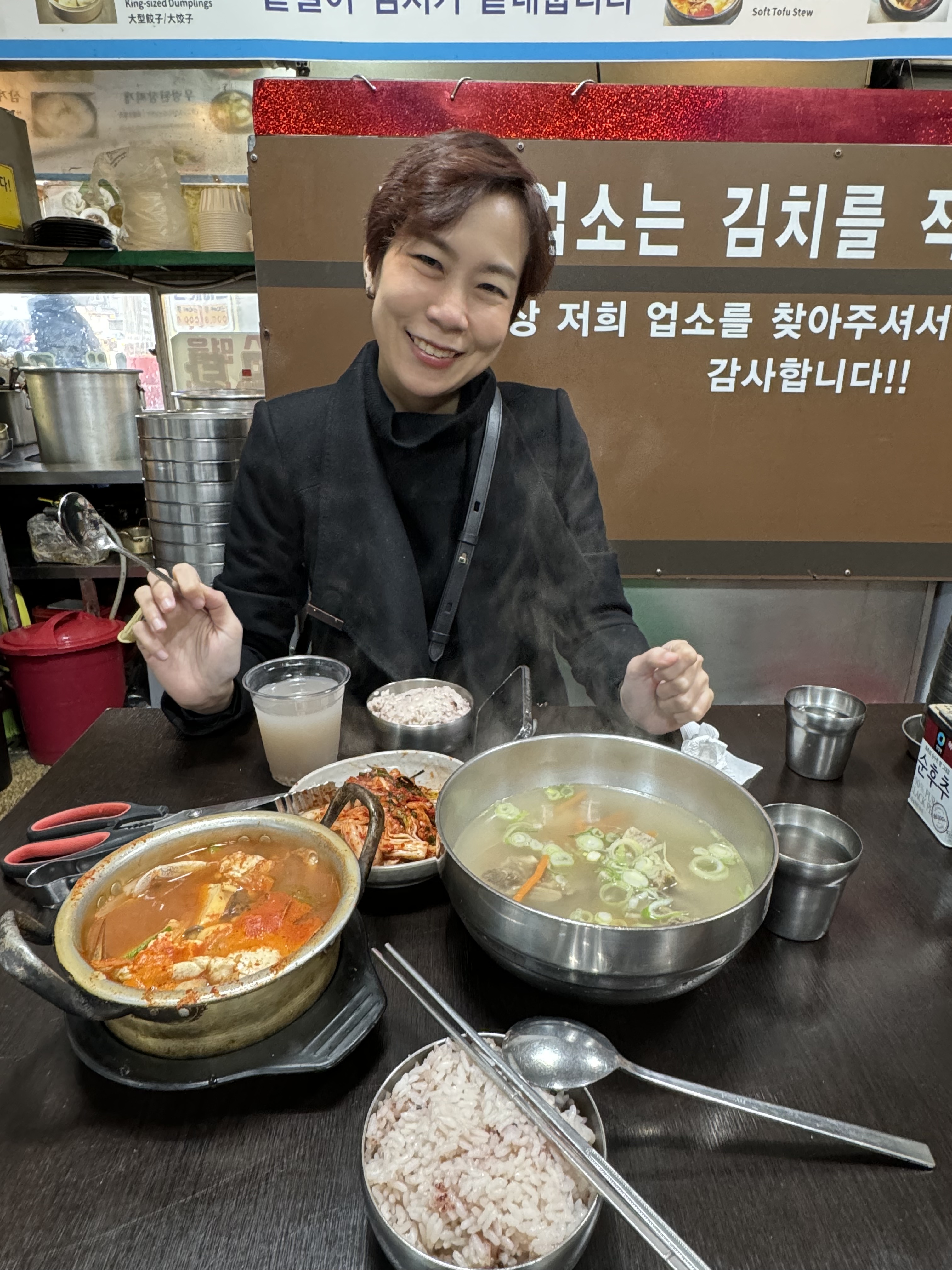 สถานที่ที่พลาดไม่ได้เมื่อมาเกาหลีก็คือ พระราชวัง Gyeongbokgung ก่อนออกเดินทางเราก็แวะกินข้าวร้านอาจุมม่าแถวตลาดนัมแดมุน เป็นร้านที่ขายซุปหลายๆ แบบ เรากับเพื่อนสั่งมาคนละอย่าง พร้อมกับน้ำข้าวที่เราเหลือบไปเห็นตอนเดินเข้าร้าน เลยขอลองซักหน่อย มันอร่อยแฮะ หวานๆ หอมๆ