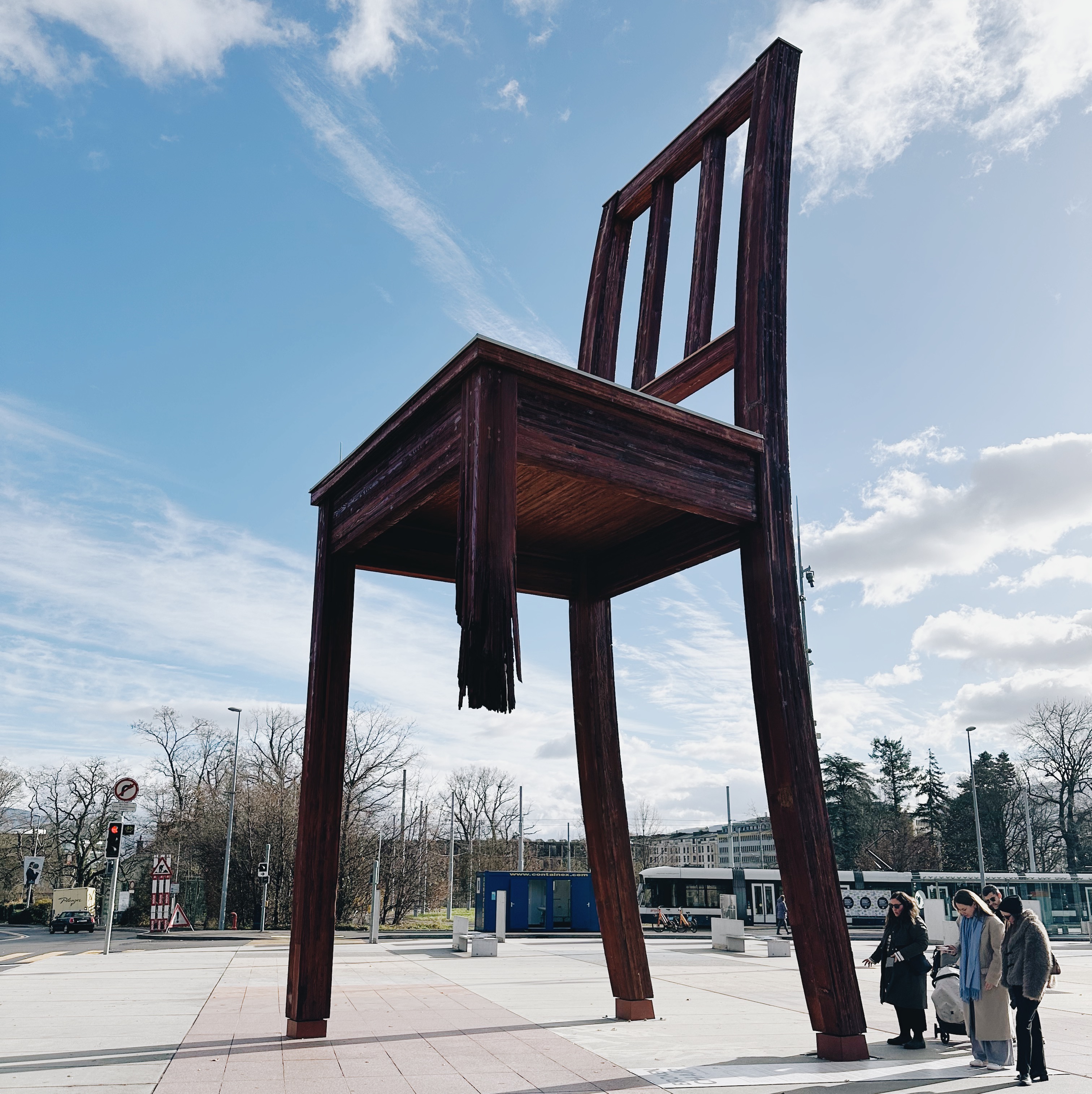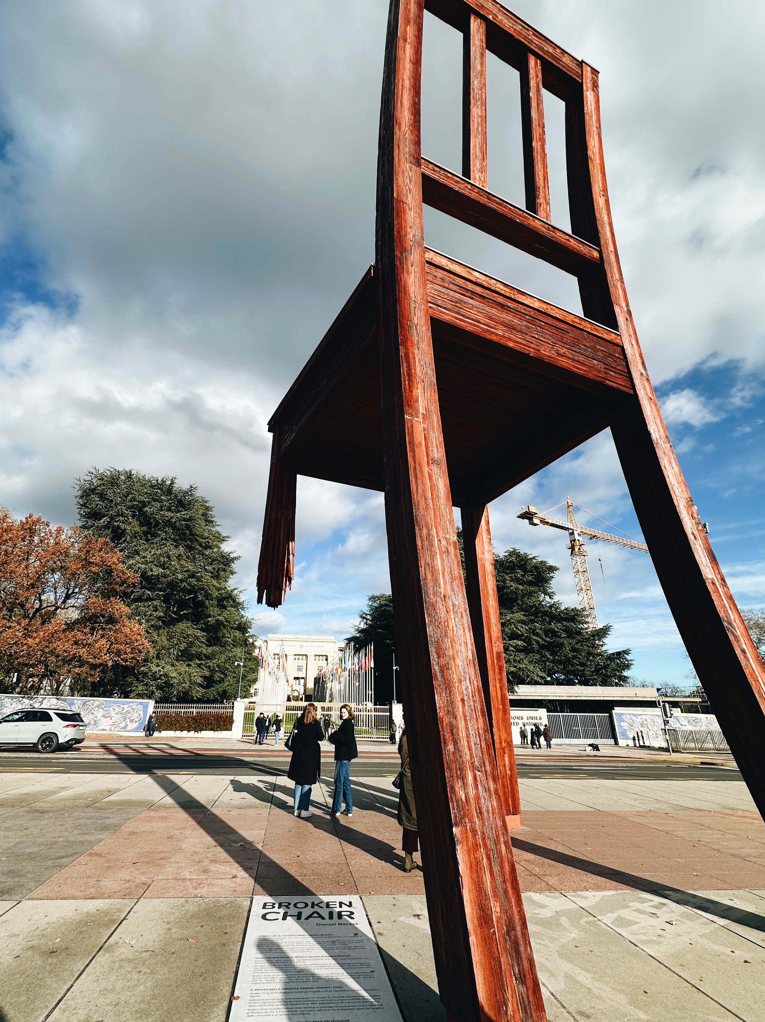 หลังจากดูมิวเซียมจบแล้ว เราก็เลี้ยวขวาออกเดินตรงมาตามถนนเพื่อไปยัง Broken Chair ซึ่งจะตั้งประจันหน้ากับองค์การสหประชาชาติ (UN) ระหว่างทางก็จะมีรูปปั้นมหาตะมะ คานธี ตั้งอยู่ในสวนทางซ้ายมือด้วย สามารถข้ามถนนไปดูใกล้ๆ ได้เลย